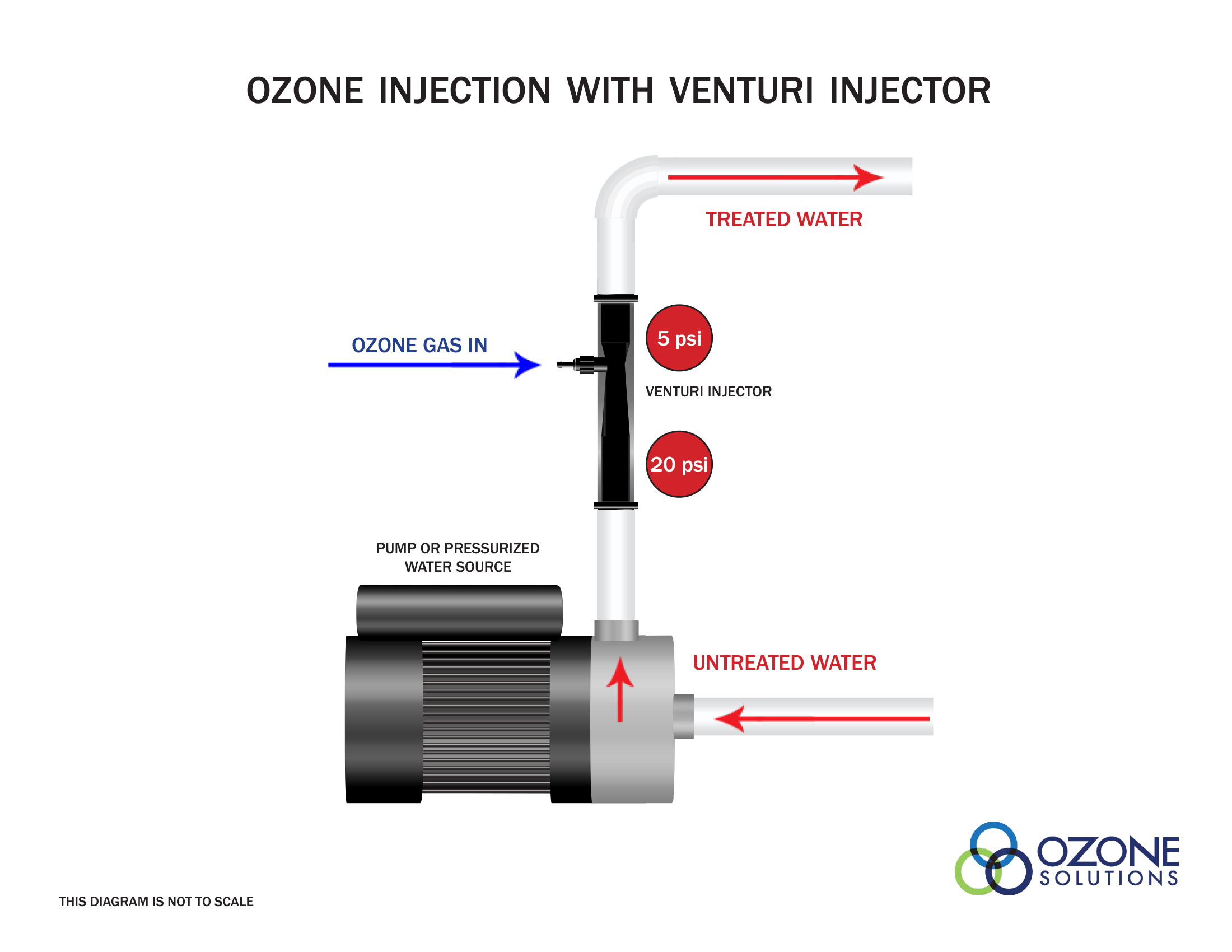 A venturi injector is a very common method of ozone injection in industrial applications. A venturi injector combines a method for ozone injection, and provides good mass transfer efficiency in one device. A venturi injector requires a pressure differential across the device to create a vacuum to pull ozone gas into the device. Then, using mixing vanes the gas is thoroughly mixed with the water.A venturi injector creates very small bubbles desired for great mass transfer and a violent mixing action to dissolve gas into water. Using a venturi injector alone may achieve mass transfer rates of 90%.